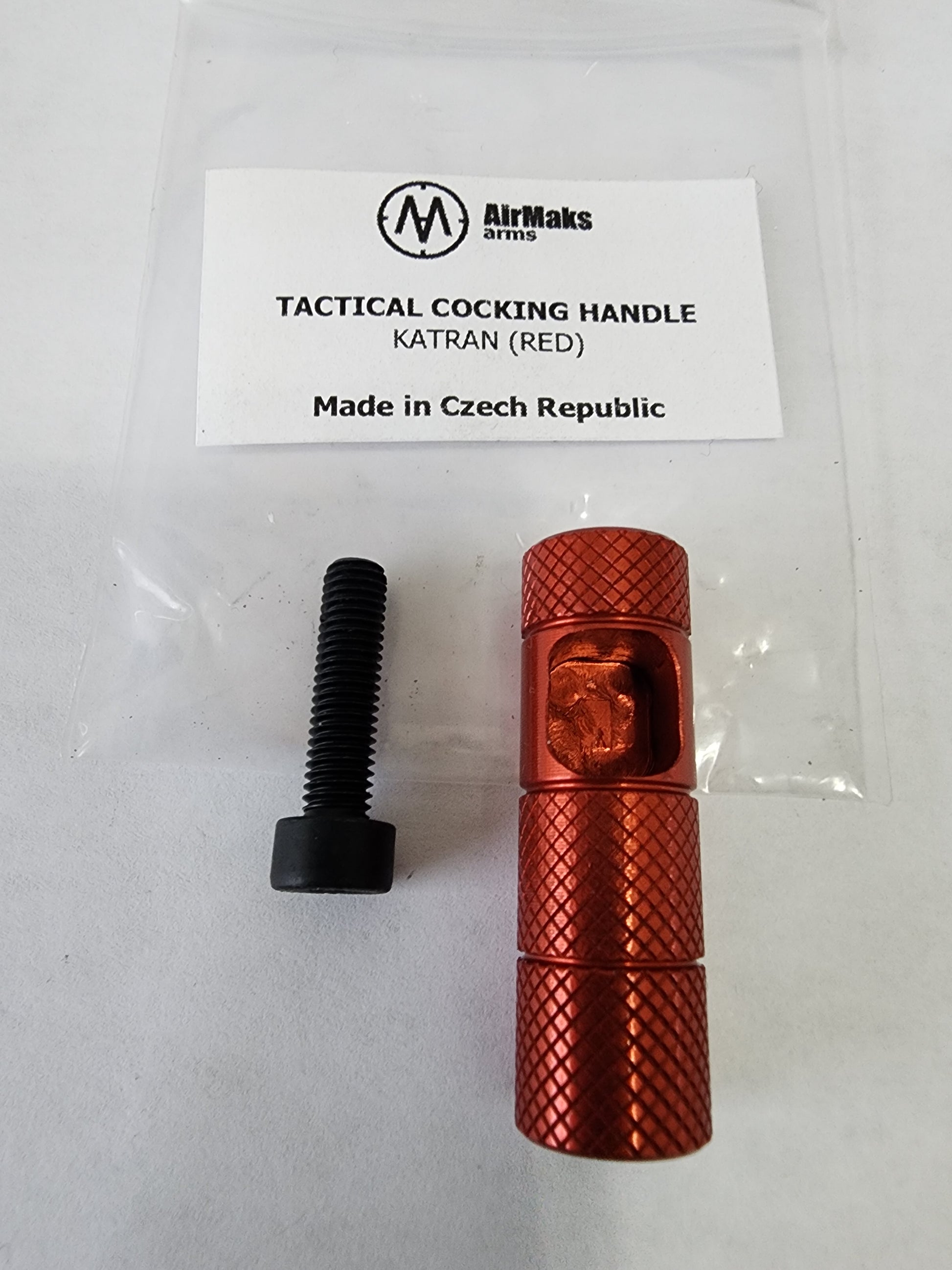 The AirMaks Arms Katran Tactical Cocking Handle in Red is a high-quality tuning component designed to replace the standard side-lever handle on the AirMaks Katran PCP air rifle. It is primarily used to customize the rifle's appearance while maintaining its technical performance.