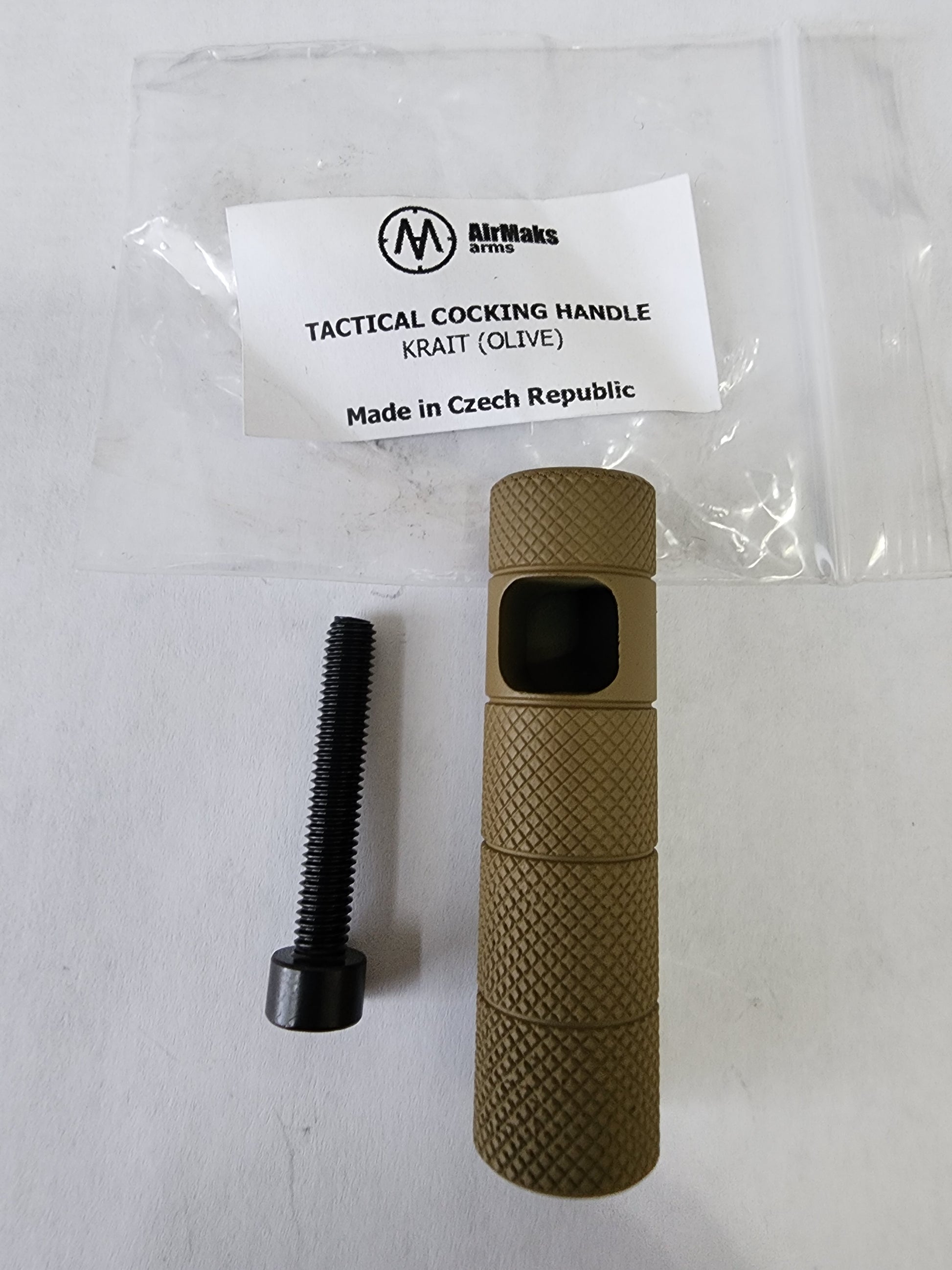 The AirMaks Arms Krait Tactical Cocking Handle in Olive is a specialized tuning accessory designed to replace the standard side-cocking lever handle on AirMaks Krait PCP air rifles. It is primarily used to customize the rifle's appearance and, in some versions, provide a more ergonomic or ribbed surface for better grip during rapid fire.